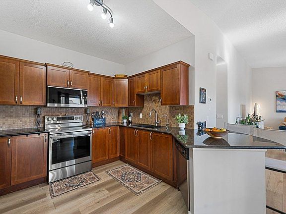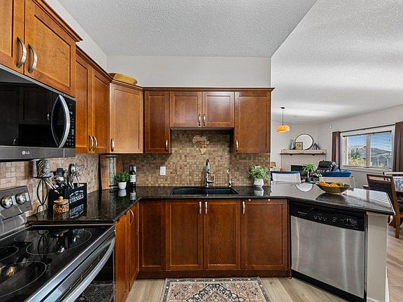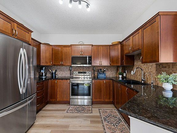 Welcome to this recently upgraded home that backs directly onto green space. Step inside and you’ll notice the vaulted ceilings and luxury vinyl plank flooring that give the main level a bright, open feel. The kitchen has been updated with granite counters and stainless steel appliances, and it flows nicely into the living room where a cozy gas fireplace with tile surround and mantle makes the perfect gathering spot. The main floor offers two generously sized bedrooms, each with direct access to the back deck. The primary suite features a walk-in closet and a stunningly renovated 4-piece ensuite with dual sinks and an oversized walk-in tiled shower. A second 4-piece main bathroom and a convenient main-level laundry room complete this floor. Downstairs, the fully developed basement provides incredible additional living space. Highlights include a large bedroom with walk-in closet and 3-piece ensuite, barn doors throughout, a spacious rec room with a walk-in storage room and an electric fireplace, and plush carpeting for comfort. Additional features include central air conditioning, an attached double garage with space for a workbench or storage, and rough-in for a central vacuum system. Ideally located close to shopping, restaurants, the CTrain, and more, this property combines thoughtful upgrades, everyday convenience, and a quiet setting.