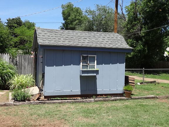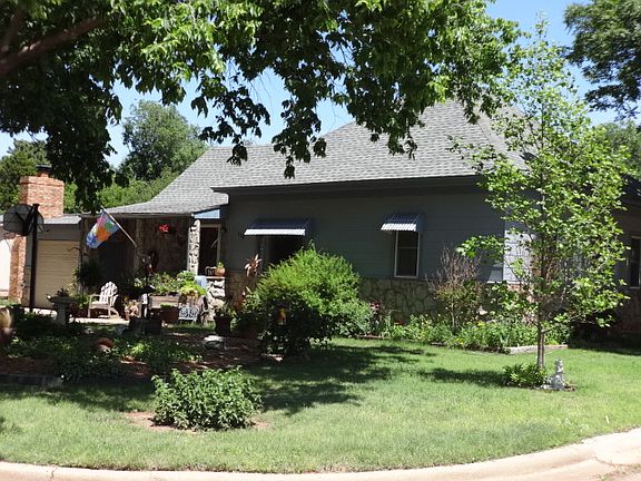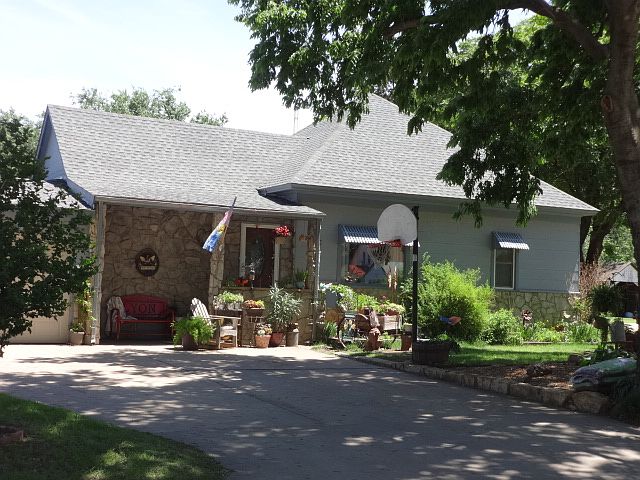 Open view from kitchen through dining room through to den. Vaulted ceiling in the den with a fireplace and a built in soda bar. Loaded with character. Master bath newly remodeled. Storm cellar with inside entrance. 2 storage buildings. 1 car garage attached.