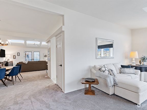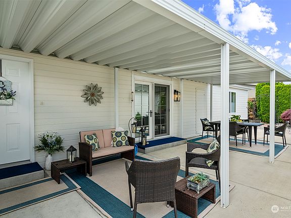 SELLER AGREES TO PAY 6 MONTHS LOT RENT IN ADVANCE AT CLOSING. So many upscale improvements chosen with taste & style! Soft greytones with big vaulted ceiling & high windows that bathe the living areas with light. Baths have been updated with new plumbing hardware. Five piece primary bath. Unusually private patio between the home & the garage is screened from the street & covered on the east side for year round entertaining. Yard has tasteful, easy care plantings with rocked beds. Kitchen has up to date appliances and countered bar opening the large space to the comfortable family room (with French doors to patio), breakfast nook & dining room. The open flow is evident in the photos!. Reference Lot 5 when contacting office.