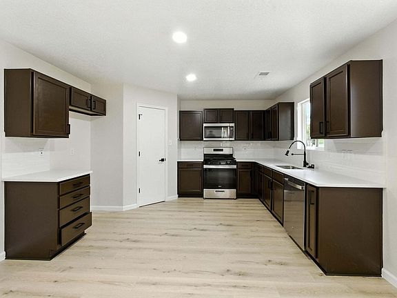 New quartz countertopsOpen flowing floorplanUpgraded kitchenBrand-new stainless steel appliancesNew sinkRefinished oak cabinetrySubway-tile backsplash