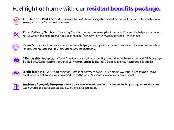 At Distinctive Real Estate, we strive to provide an experience that is cost-effective and convenient. That's why we provide a Resident Benefits Package (RBP) to address common headaches for our residents. Our program handles pest control, air filter delivery, utility setup, identity protection, rent rewards, and credit building at a rate of $39.95/month, added to every property as a required program. More details upon application. In addition to RBP, we provide access to liability insurance that meets your needs.