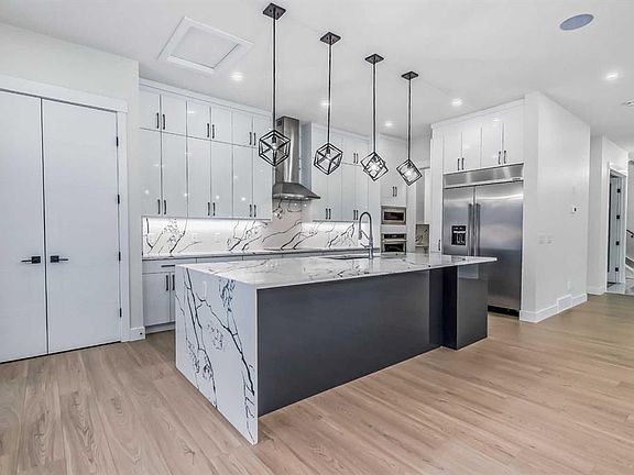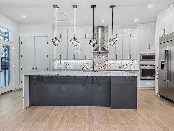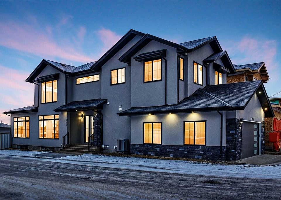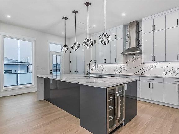 Welcome to Winston Heights, conveniently located just steps away from the golf course. This contemporary infill corner home offers nearly 3,600 square feet of living space. The property features an expansive attached garage, complemented by a separate detached garage, providing a total of four car parking spaces. The residence includes five bedrooms and 3.5 bathrooms. Abundant natural light permeates the entire home, thanks to its large windows. The main floor boasts 10-foot ceilings, an open-concept living area with premium finishes and appliances. The kitchen, featuring a marble backsplash and quartz countertops, seamlessly connects to the main living area, separated by a large island. Additionally, a gourmet kitchen and an office are situated on the main level. A glass railing guides you to the upper level. Upstairs, you will discover a spacious primary bedroom with a 5-piece En-suite and a walk-in closet. There are also two additional bedrooms, a full bathroom with dual vanity sinks, a laundry area, and a bonus room. The property includes a legal basement with a separate entrance. The basement features two well-sized bedrooms, a full bathroom, and a separate laundry facility.