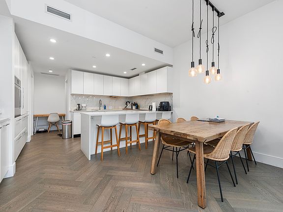 Corner unitFunctional layoutAmple storage spaceSeamless designStainless-steel microwaveBosch dishwasherHerringbone-patterned hardwood