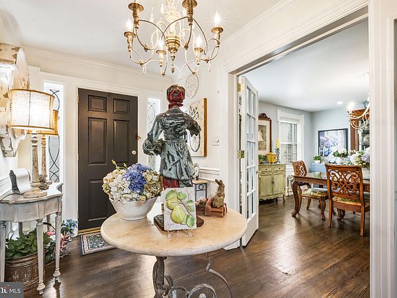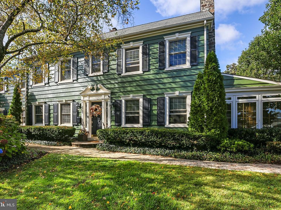 6+ bedroom, 3.5 bathroom center hall colonial home in Drexel Park, with a crisp freshly painted exterior and refinished hardwood floors in nearly every room. This stunning home has classic details, modern updates, and all the flexible interior space you could hope for, plus a charming fenced yard and large two-car garage. Enter the home through the front door to the center hall with walnut hardwood floors, convenient powder room, and an elegant staircase with curved wooden banister. To the right you will find the large living room with a brick fireplace and built-in shelves and cabinets. Through two sets of French doors, access the adjacent sunroom, flooded with light through wood casement windows, transoms and skylights. This room also has a stone fireplace On the other side of the center hall, the dining room boasts a beautiful chandelier and ornate ceiling rose. The dining room is open to the kitchen across a large wood-topped peninsula. The kitchen has been updated and improved by the current owners. It has granite countertops and a stainless steel Viking gas range, a matching refrigerator, dishwasher, a built-in microwave, and a large stainless steel sink under a window that looks into the backyard. There is also a cleverly designed pantry closet with pull-out shelves, and a butler's pantry. Other thoughtful kitchen details include soft-close drawers and cabinets and recessed overhead lights. From the kitchen, the side door leads to the driveway, garage and picket-fenced back yard. The elegant staircase is topped with a beautiful arched window. And upstairs on the second floor, the primary suite is an elegant retreat with a stone fireplace and a luxurious en-suite bathroom. It has dual sinks, a glass enclosed shower with subway tile surround and built-in bench, a water closet and striking floral tile floor. The large walk-in closet is also accessed through this bathroom. Also on this floor, there are 3 more bedrooms and an office, and a stylishly updated hall bathroom. It has direct access to the second bedroom through one door and to the back hallway through another. At the rear of the 2nd floor, there is a convenient laundry room with side-by-side washer and dryer, a tile floor and storage space. The 3rd floor includes another 2 rooms, a third full bathroom, and a large cedar closet. This 3rd floor could be used an another suite, making this home perfect for multiple generations or accommodating guests. Several bedrooms could serve as home offices, craft rooms, etc. Downstairs, half the basement is finished as a great room with another fireplace and the rest is good for storage. Outside, the fenced back yard is convenient for pets or kids, the landscaping provides privacy, and there is a large patio for outdoor entertainment.
