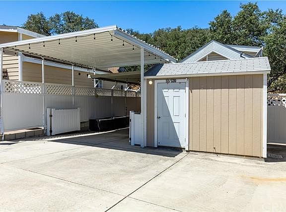 This simply stunning home is ready to be your weekend getaway! Located within the gated lake community of Heritage Ranch, near the end of a cul-de-sac. This park model home has high ceilings with lots of windows bringing the outside in! The open concept floor plan offers plenty of space for entertaining while maximizing its space. Outside you will find a deep carport leaving room to entertain and space to park some toys. A beautiful fence was added behind the carport to contain pets or kids. The shed was thoughtfully converted to a laundry and utility room by a previous owner. The furnishings are not included but may be negotiated outside of escrow. Come see this sweet getaway.