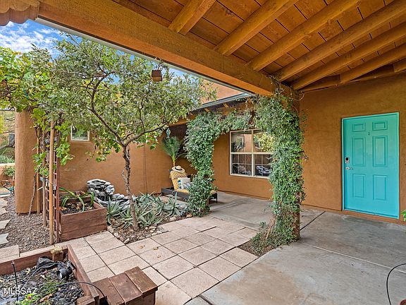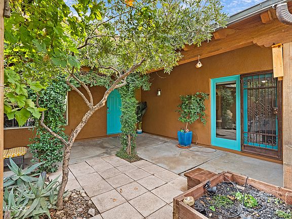 This is it! Welcome to the exceptional community of Civano. Enter through the courtyard into this 3bd/2ba home with split floorplan and high wood/beamed ceilings. The great room has mexican tile and beehive fireplace to complete this Sante Fe style home. The upgraded kitchen offers SS appliances and plenty of storage. Step outside to the covered patio and private backyard with plenty of area for gardening and water features. All bedrooms have custom closets and tile. The primary bedroom has updated bath and door to the front courtyard. The home features newly painted exterior, owned Solar, Reverse Osmosis system, Electric car charger and storage rack in garage. Civano is a sustainable community featuring pools, pickleball, tennis, Neighborhood Center and playground. Open House Sun 12-3