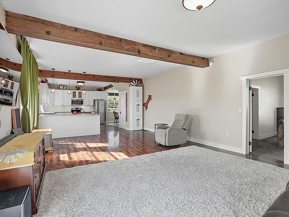 Welcome to this updated 3-bed, 3-bath home on 10 acres of private and secluded land. The home was updated in 2016 with a new roof, windows, flooring, and fixtures. You will love the open floor plan with rustic exposed beams and the chef's kitchen featuring granite counters and a vintage farm sink. The large main-floor primary bedroom is a private retreat with a walk-in closet and a bath featuring a claw-foot tub and separate shower. The utility of this property is unmatched, with a 3-car garage, a massive 36' x 60' Quonset shop (concrete floor), PLUS a 40' x 70' equipment barn. Enjoy the peaceful setting as the only home on a quiet dead-end road, complete with a greenhouse, bunk house, and productive well. This property delivers the ultimate combination of modern comfort, complete peace and superior utility.
