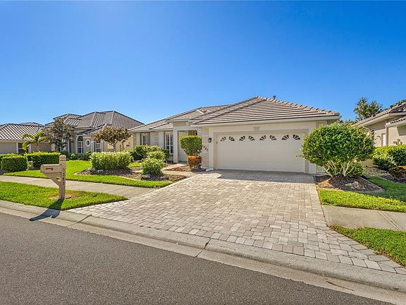Come enjoy this impeccably kept beautiful 3 bedroom 2 bath, heated saltwater pool home with golf course views in the exclusive gated golf course community of Heron Creek Golf and Country Club! This gorgeous home features a brick paver drive and front porch leading to the leaded glass double door entry. Once inside you will be greeted by soaring tray ceilings complimented by crown molding in the expansive great room with triple sliders leading out to the lanai and pool including peaceful views of the #1 hole of the Marsh course. The formal dining room is a perfect place to enjoy a lovely meal with your friends and family. The kitchen is nicely appointed with an abundance of solid wood cabinetry, brand new Stainless Steel Refrigerator, stone countertops, breakfast bar and closet pantry. Adjacent to the kitchen is the breakfast nook with aquarium windows to enjoy the serene views of the pool and golf course. The expansive owner’s suite features, engineered hardwood floors, crown molding, pool access door, and lots of windows allowing the natural light to flow through. The ensuite bath includes separate sinks with stone counter tops, glass block walk in shower and soaking tub. This home design is a true split floor plan with the guest bedrooms on the opposite side of the home creating the utmost in privacy for you and your guests. The guest bedroom in the rear of the home has sliding doors that lead out to the lanai and pool area for easy access. The second bath is shared by the two guest bedrooms with a walk in shower, solid wood vanity with stone countertop. The lanai pool area is truly an oasis with a new expansive deck, serene views and the ideal southern exposure. Lots more nice features about this home including, New Roof, New AC, New Pool Heater, and Hurricane Shutters for peace of mind. The location of the home is outstanding! It is within walking distance to all Heron Creek has to offer… such as 27 holes of Arthur Hills designed golf course, 5 Lighted Har Tru tennis courts, remodeled fitness center, resort style pool and spa, newly renovated Courtside Cafe, 21,000 sq ft Clubhouse where you can enjoy casual and fine dining, not to mention the lengthy list of all the social activities! Heron Creek Golf and Country Club is close to area beaches, shopping, restaurants, Warm Mineral Springs, Cool Today Park and more. NOW is the time to make this special home yours today!