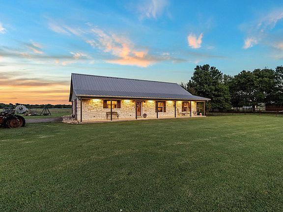 Welcome to 5285 County Road 3226 in Lone Oak, a ranch style home set on 9 acres with an agricultural exemption. Built in 2007, this residence showcases a brick and stone exterior, covered porches and metal roof. Inside, the home offers three bedrooms and two bathrooms with beautiful wood ceilings and a wood burning fireplace that creates a warm and rustic atmosphere. You'll love the primary suite and bathroom with large walk-in closet, dual sinks and separate shower and bath.