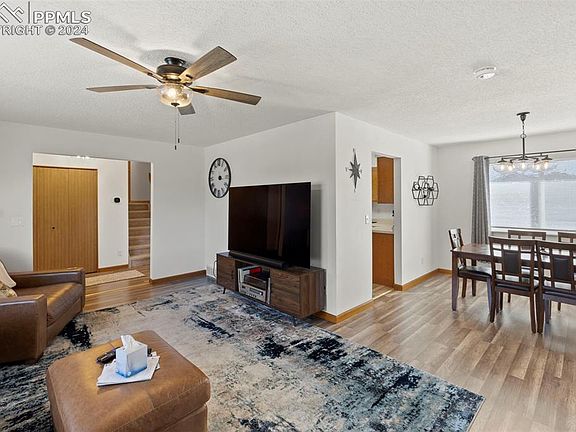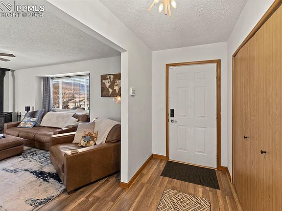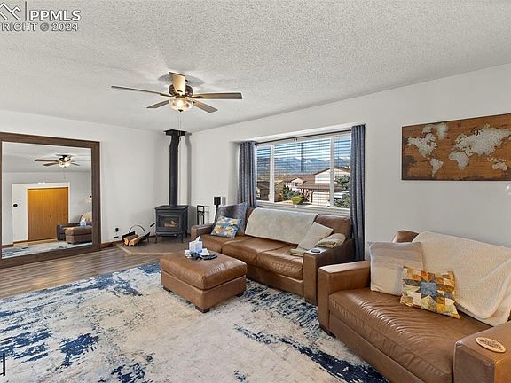 Set on a corner lot with stunning views of Pikes Peak and the Front Range, this 4-level home offers 4 bedrooms, 3 full bathrooms, and plenty of thoughtful upgrades. The main level features a spacious living room with a wood-burning fireplace, a dining area with luxury vinyl plank flooring, and a kitchen with stainless steel appliances, a gas range, and ample cabinet space. Upstairs, the primary suite includes a five-piece bath with a soaking tub, while two additional bedrooms and a full bath complete the level. The lower level boasts a gas fireplace and walkout access to the fully fenced backyard, which includes mature trees and a storage shed. The basement provides a fourth bedroom, a separate bathroom, a family room, and a laundry area. Additional features include all-new light fixtures, new light switches on the upper level, an insulated two-car garage, RV/boat parking, and no HOA. Conveniently located minutes from great schools, shopping, and the Colorado Springs Airport, this home is perfect for everyday living.