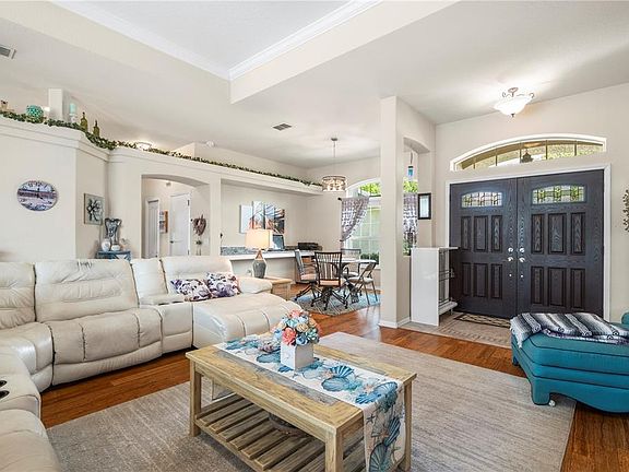 Welcome to your dream pool home, ideally located on the 4th fairway of Oak Hills Golf Course. NO HOA, NO CDD, NON FLOOD ZONE. Recent upgrades provide peace of mind, including: NEW 2025 ROOF, NEW POOL PUMP, NEW POOL HEATER, NEWER WINDOWS, NEW APPLIANCES, NEW VINYL FENCE, NEWER MOTION LIGHTS. Additional features include a spacious indoor laundry room with sink and generous storage throughout, in ground sprinklers, alarm system for safety, updated landscaping, three car garage, and paved spot on side of home for a trailer. From the moment you step inside, you’ll be captivated by the open great room featuring a tray ceiling, modern fan, and rich hardwood flooring. Sliding glass doors create a seamless connection to the expansive screened lanai—perfect for enjoying sweeping views of the heated pool and manicured fairway beyond. This thoughtfully designed split floor plan offers both elegance and functionality. The formal dining area adds a touch of sophistication, while the light-filled kitchen is a chef’s delight with a breakfast bar, abundant UPGRADED cabinetry, pantry, and upgraded high-end stainless steel appliances. Sleek tile flooring complements the kitchen’s modern feel. Retreat to the spacious primary suite with its own tray ceiling and dual closets. The spa-inspired en-suite bath includes dual sinks, a garden tub, and a walk-in shower for ultimate relaxation. A convenient pool bath allows easy access to outdoor spaces without disrupting the flow of the home. Step outside to your private oasis, complete with a brick-paved pool deck, new LED-lit heated pool, and a newly fenced yard with a retaining wall. You'll love the peace and privacy. This exceptional home offers comfort, style, and resort-style living year-round. Don't miss the opportunity to make it yours.