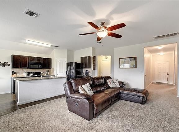 1-story, 3/2 floor plan. Open concept living room with reclaimed wood wall. Kitchen has an island, granite counters, and walk-in pantry. The master is a relaxing haven with ample natural light and the closet is outfitted with custom shelving and a hidden storage area. The secondary rooms are separate from the master and each have a walk-in closet. Big back yard with a covered patio. High-end water softener & filtration system, refrigerator, and playscape convey!