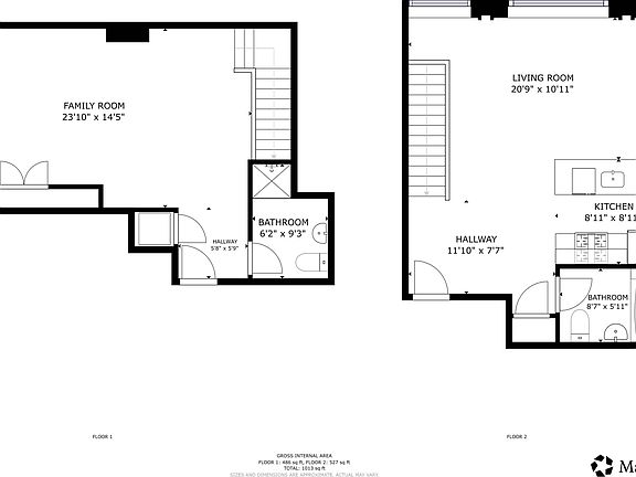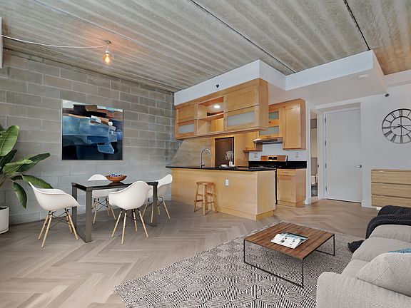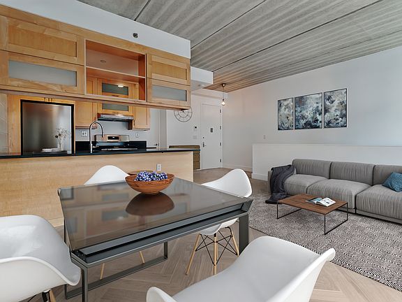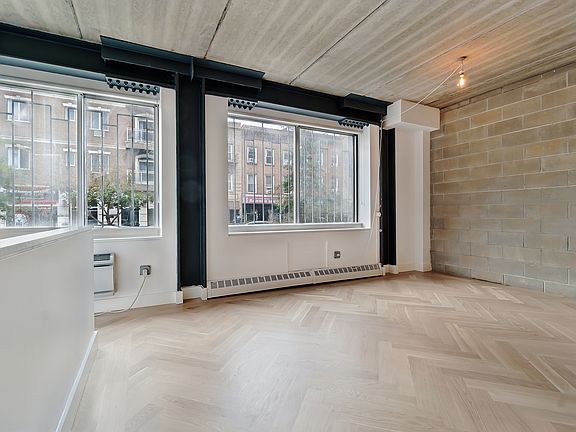 Unit #102 is a unique, loft-like residence offering 1100 square feet spread across two floors. It features high ceilings, large windows, and distinctive concrete and cast iron elements, all contributing to its character. Each element has been meticulously crafted using the finest materials. A restoration has just been completed, including brand new blonde herringbone wood floors on the upper level and high-end, full-sized appliances such as a 5-burner stove, Bosch dishwasher, counter-depth refrigerator, and a combination HE washer/dryer. The kitchen boasts honed marble countertops and custom maple cabinetry. Both bathrooms feature clean lines, neutral tiling, and premium finishes; one includes a cast iron tub, and the other a fully tiled shower.