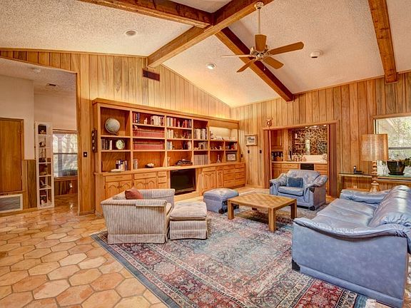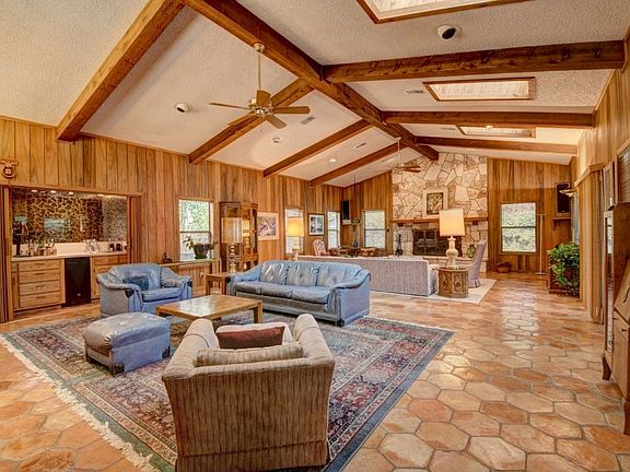 Bright & wonderful home on 5.23 acres in desirable Tierra Linda w/huge great room w/wood beamed cath ceiling, floor-ceiling stone WB fireplace, wet bar, built-ins & wrapped in warm, wood paneled walls. Lg windows & skylights ensure bright, nat light. Kitchen w/high ceilings & tons of nat light from dbl-height, over-sink window & skylight, solid surf counters & so many cabinets, you might wonder how to fill them all! Bar counter & dining area-perfect for entertaining. Lg cov'd patio w/skylights & fenced yard. Spacious studio w/sep entry, bright interior w/skylights & cov'd patio. Mature trees.