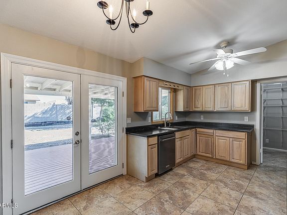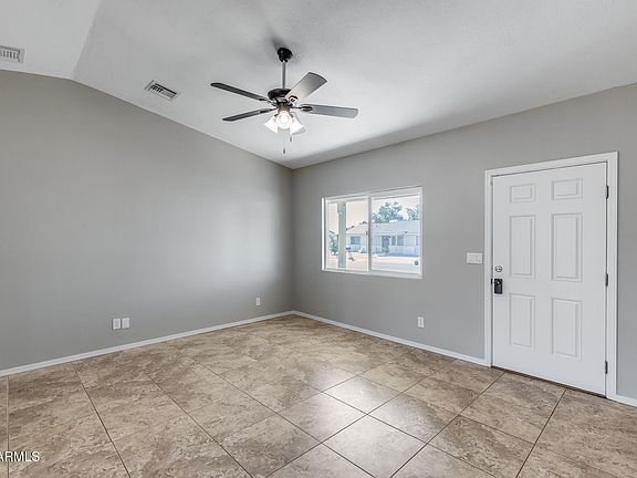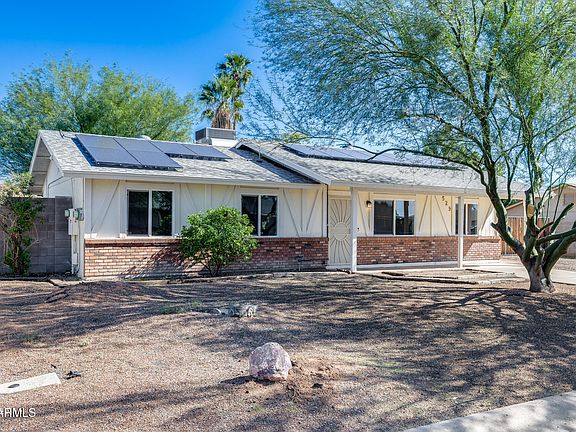 Upgraded & Solar-Powered! This remodeled home features vaulted ceilings & tons of natural light. The spacious living area flows into the dining & updated kitchen, showcasing dark countertops, SS appliances & French doors opening to the backyard. The primary suite includes its own bath, while additional bedrooms share a full bath with custom tile work & new fixtures. Outside, enjoy a large covered patio surrounded by block fencing, RV gate with paved rear parking & a charming covered front patio for relaxation or entertainment. The home includes owned solar, offering efficiency & savings year-round. With NO HOA, convenient access to Loop 202, Taft Elementary, shopping, dining & recreation, it's a blend of modern updates & central convenience—making daily living effortless & enjoyable.