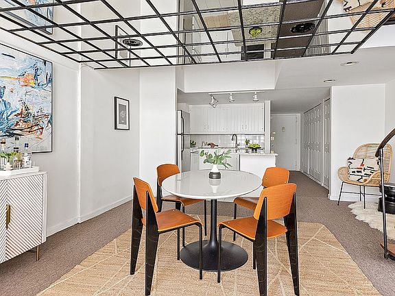A distinguishing feature of this residence is its private entrance on 536 West 43rd Street, shared by only eight homes in the building, offering townhouse-style convenience with the services of a full-time building.