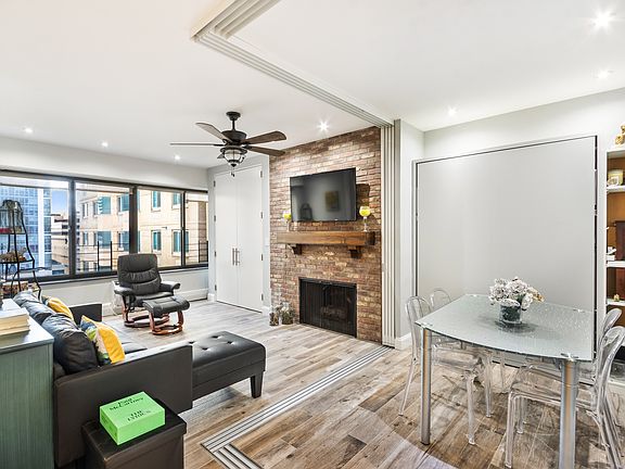 The open concept living space includes a modern kitchen with breakfast bar, high-end appliances, and pantry. Highlights include a wood-burning fireplace, western sunlight, space for a dining table, large custom closets, separate den/office, and a bonus flex space with a murphy bed that can be closed off for overnight guests. The large bedroom, set away from the main living space, comfortably accommodates a king-size bed and has a new en-suite half bathroom. The adjacent full bathroom has been newly renovated with navy and white finishes, and includes a new shower stall and linen closet.