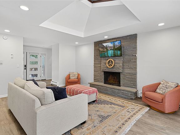Inside, cathedral ceilings and a skylight fill the main living space with natural light, while the wood-burning Llenroc fireplace adds warmth and character. Generously sized rooms throughout offer flexibility for modern living, work-from-home needs, or multigenerational space. The lower-level family room features a freestanding fireplace and access to the backyard, creating additional living and entertaining possibilities. A bedroom and full bathroom on the lower level offer comfort and privacy for guests, extended family, or a home office suite.