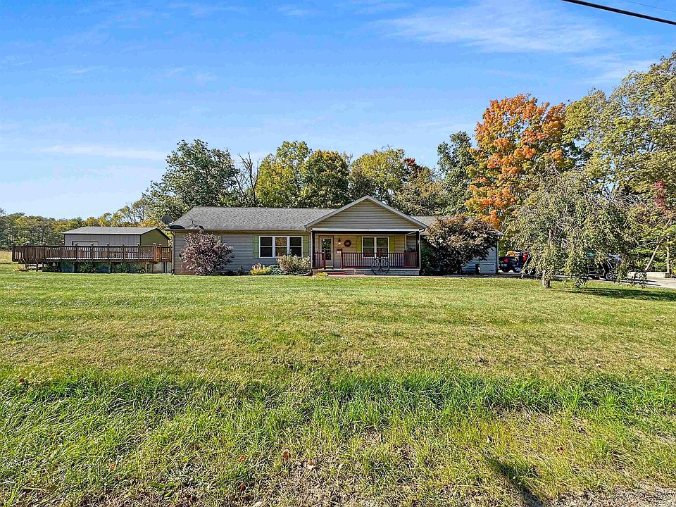 This charming 2 bed, 2 bath ranch sits on approximately 2 acres and has so much to offer. The updated appliances make cooking a breeze, and the attached dining area is perfect for enjoying meals and conversations. You'll love the large, welcoming living room with a cozy gas log fireplace, ideal for entertaining or relaxing. Both bedrooms feature their own private baths, while an additional half bath is conveniently located in the heated attached garage, set up as a perfect man cave. Step outside to a fantastic deck and patio area, complete with an above-ground pool and hot tub, perfect for barbecues and outdoor gatherings. For the hobbyist or crafter, the she-shed provides a great workspace, and the pole barn offers over 900 square feet for storage or projects. Surrounded by woods, this peaceful property is the ideal setting for quiet evenings.