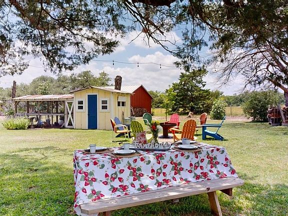 This inviting home blends classic farmhouse character with modern comforts, featuring shiplap walls, a tin ceiling, and custom-crafted beds. There is wood for the fire pit under the cedar tree, and lighters are in the kitchen drawer. One starter brick starts a fire.