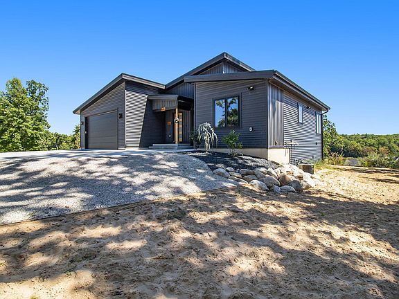 Love where you live! Don't miss out on this better than new contemporary home with amazing water views and access to Pettit lake surrounded by all new homes! Don't they say be the least expensive house in the best neighborhood? This is it! Built in 2022, this amazing home is loaded with natural light and modern straight lines. The main floor boasts beautiful LVP flooring making for easy maintenance and a nice open floor plan with a bedroom and a bath on either side of the living space offering great privacy for guests or kids. You'll love the white walls and black cathedral ceilings in keeping with the contemporary design of this well thought out home. The lower level has plenty of room to expand and add 2-3 bedrooms, a family room, and it's already plumbed for a full bath.  The maintenance free deck off the living room will be the perfect daily spot for coffee and cocktails, and did I mention the view?! Trees and water and sky abound! A few additional perks include maintenance free landscaping, a metal roof, hot and cold water in the garage generator hook up and fiber optic wifi. The association has many great features, including a sandy beach/volleyball area, a  community garden and a boat launch, along with the availability to purchase a dock! Don't miss out on this gem.  Call today!