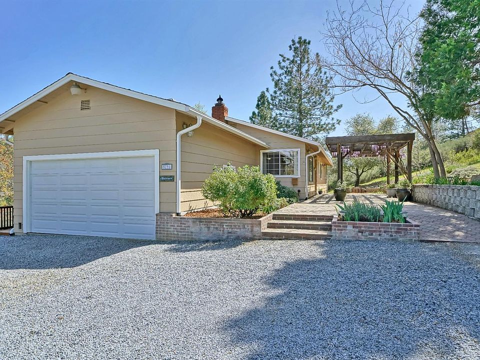 Charming home in Pleasant Valley on almost 2 usable acres! The front entry is graced with a shaded patio & lovely wisteria draped pergola. Recent updates include gorgeous luxury vinyl plank flooring throughout main living areas & newer carpet in bedrooms, exterior paint, deck staining & newer kitchen counters. French doors lead to beautiful local views from the spacious shaded deck. Fenced garden area with raised beds. Plenty of room for RV or boat parking. Don't miss the workshop area under the house for your hobbies & extra storage.