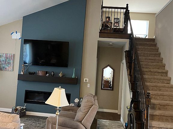 Electric fireplaceLarge islandFull basementTree lined backyardHardwood floorsVaulted ceilingBeautiful granite counters