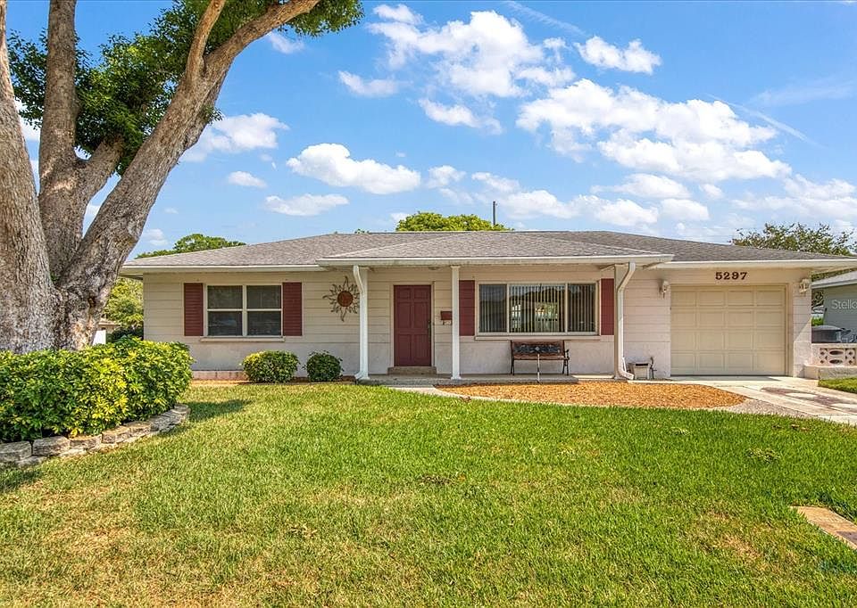 One or more photos virtually staged. Welcome to this charming single-family home located on a large corner lot and centrally located in northwest St. Petersburg’s Brentwood Heights neighborhood! This well-maintained concrete block home features a bright and sunny kitchen with lots of cabinet space, 2 bedrooms and 1 bathroom, and plenty of closet space. In addition to a large closet, the second bedroom also includes attractive built in storage cabinets. This home is move in ready and includes hurricane window panels, irrigation system, gutter guards, and the convenience of a 1 car garage for easy and weatherproof access to your home. Outside, the covered back patio offers an oasis with a beautifully landscaped yard and mature trees, perfect for enjoying the outdoors and Florida sunshine, or simply relaxing with family and friends. But that’s not all – this home also boasts terrazzo flooring under the carpet and tile AND is designated Flood Zone X! This beautiful home is centrally located near shopping and restaurants and minutes from the Interstate, downtown St. Petersburg, and the best beaches in Florida! Don’t miss the opportunity to make this wonderful home your own!