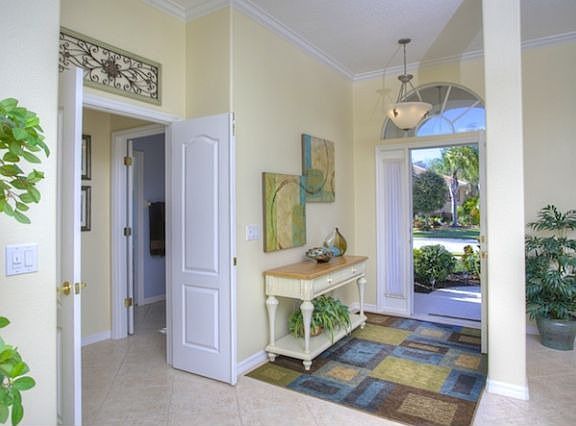 This home was the largest built in the wonderful neighborhood of Carlyle. This is a true 4bed/3bath/3car garage 2002 one story home. A special lot with wide lake views. Water Views from every room in house with an Infinity pool effect and oversized lanai. Gorgeous landscaping provides privacy. This home was originally designed by Architect owner who added 2 extra feet to garage, baths and bedrooms. Higher construction elevation offers 14ft great room ceilings with extra large picture window and 10ft ceilings throughout. Architectural niches. Gas cooking for the chef with new stainless appliances, tile backsplash, up and down lighting, and new granite. Gas heated Salt water pool with spa. Built in Thomasville Cabinets in dining room, Bay window master suite and tray ceiling, Roman shower, 36" vanity heights. Security system, pre-wired for sound. 20"Diagonal tile throughout, new bedroom carpet, extra large closet space. This home is meticulously maintained and rarely used by its owners. Convenient to downtown Sarasota and all that this city of Arts and Culture offers. Located in the Palm Aire Country Club area where there are many different types of membership offered and just a golf cart ride away. Low HOA fees. This really is a must see to appreciate all the details.