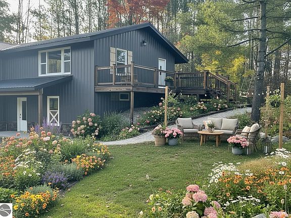 Outdoors Enthusiasts, this contemporary and spacious two story home featuring 4 bedrooms, 3 bathrooms, high speed internet and situated on 3 acres just 4 miles south of East Jordan and the South Arm of Lake Charlevoix may just be the property you have been waiting for. The main floor offers an open-concept great room combining the living room, dining area, and kitchen. The home is virtually a new build. The original footprint was used, however, it features completely remodeled spaces: 1. New metal roof and siding provide a contemporary look and ease of maintenance; 2. New luxury vinyl plank flooring enhances the living room, stairways and hallways, creating a modern and cohesive look; 3. Three bedrooms and two beautifully tiled baths are located on the main, walk-up level; and 4. The new kitchen includes granite countertops and GE Stainless Steel Appliances with Slate Matte finish that hides fingerprints for easy care. Ample storage is thoughtfully integrated throughout the home with numerous closets and storage areas. The finished basement adds approximately 1,400 square feet of versatile living space, ideal for entertaining or family gatherings. It includes a spacious family room, a fourth (non-conforming) primary bedroom, a tiled bathroom, storage room and new mechanicals. Outdoor living is enhanced by a back deck perfect for dining al fresco. A completely restored, two story outbuilding provides additional storage and functionality. The property has fruit trees, a generous yard, established plantings, and a creek. Located near Snowmobile and Hiking Trails, Webster Bridge and Rogers Bridge End (Jordan River Accesses for kayaking and fishing), Raven Hill Discovery Center, Cosner Preserve, East Jordan, Boyne City, and more. This property combines comfort, space, and outdoors enjoyment in a peaceful Northern Michigan country setting.