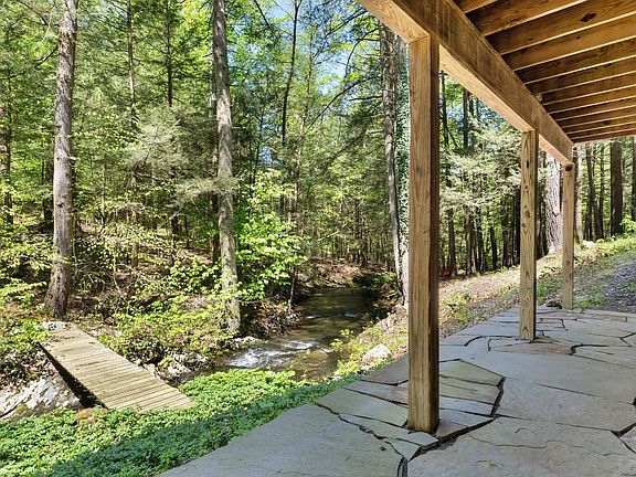 A few additional features include a fire pit nestled into a pine grove, a welcoming and manicured approach, a fenced in yard for furry friends, a sweet storage shed, a waterfall and a bridge across the stream to explore the magnificent natural setting.