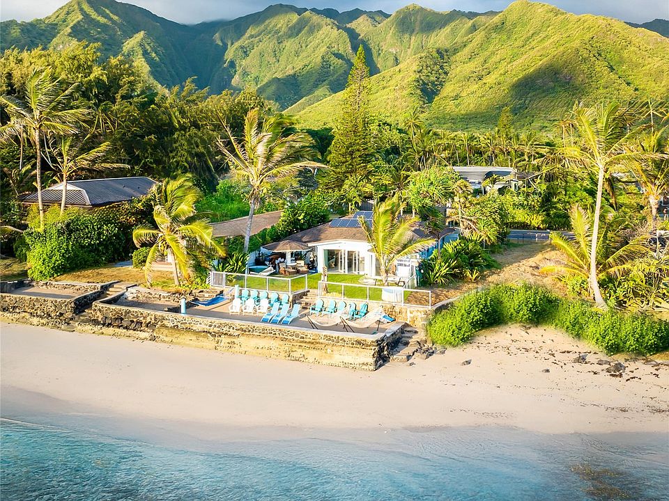 Experience an iconic, single-level, fully remodeled, ethereal corner BEACHFRONT estate with extremely high rental revenue, matching homes that have sold for over $24M on Oahu. This landmark location is protected by a grandfathered oceanfront seawall enclosing a private natural sand beach that makes this home a one and only. Relax in Kalaipaloa Point's largest oceanfront lot with panoramic mountain views of Sacred Falls & the Jurassic Park movie set, just 10 minutes from the Ritz Carlton, Kualoa Ranch and PCC, the #1 voted attraction in Hawaii. Your private zen sanctuary primed for indoor-outdoor entertaining is a turnkey multigenerational legacy home with 100 linear ft of ocean frontage that blends timeless Aloha with top-tier modern aesthetics. Enjoy your soul rejuvenating private beach area and grassy manicured laws with front-row access to waist-deep-reef-protected waters perfect for snorkeling, kayaking, fishing, turtle watching, swimming, 3 beachfront jacuzzis, 2 hot-water outdoor showers, gazebo with electrical outlets, Wolf appliances, 4-layered soundproof walls, home theater, solar PV, generator, attached garage, coral rock walls & smart glass fence with dancing LED lights.