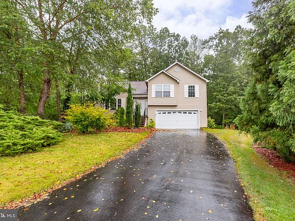 Spacious Multi-Level Home on a Private 1.05-Acre Cul-de-Sac Lot. Discover this 2,600+-square-foot one-owner residence offering privacy and convenience near Quantico, Amtrak/VRE, I-95, and commuter lots. The open floor plan showcases 20-foot vaulted ceilings, rich oak hardwood floors, and a bright main dining area that extends to an enormous 24' x 34' deck with gravel underneath, overlooking mature woods for complete seclusion. A striking red-granite kitchen island, ventilating skylight, and attic fans enhance comfort and style, while a dramatic monolith wood-burning fireplace with built-in fans adds warmth and character. This home provides four bedrooms—including a primary suite with a walk-in closet and full bath—plus an additional 1.5 total baths. Tile flooring accents the bathrooms and lower-level laundry room with generous shelving and storage. The extended bi-level kitchen/dining and living room layout offers excellent flow for everyday living and entertaining. The lower walk-out level features a welcoming family room, half bath, a laundry and storage area with plenty of shelves, and the 4th bedroom. A double-car garage with abundant shelving, 200-amp electrical service, and a drought-resistant zoysia lawn with rain-water collection system for the large 30' x 30' raised garden round out thoughtful upgrades. Move-in ready and beautifully maintained, this distinctive property combines modern amenities with natural tranquility—perfect for comfortable living and memorable gatherings. (sqft is approx)