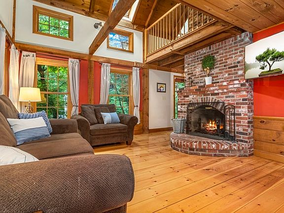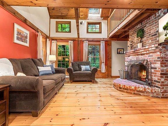 OPEN HOUSE CANCELLED This Gorgeous custom open concept 1984 Maine Post & Beam is set back privately from the road with large circular driveway. This stunning home features, Interior balcony and lovely pine floors. 2 story beamed dining room with skylight & 2nd floor interior balcony is open to Updated Kitchen with Granite countertops, island and SS appliances. Current owners added mudroom and 1/2 Bath off kitchen plus showered bath in basement. Large Livingroom with bow window is open to sitting room/office. Second floor includes 2 Bedrooms with vaulted ceilings and Full Bath with skylight and vaulted ceilings. Primary Bedroom has 2 closets, one is cedar. Finished basement includes family room with wood stove, bonus room for office or guest room and bath. Large fenced private backyard and screened porch. 4 Bedroom Septic System. This is an awesome house.