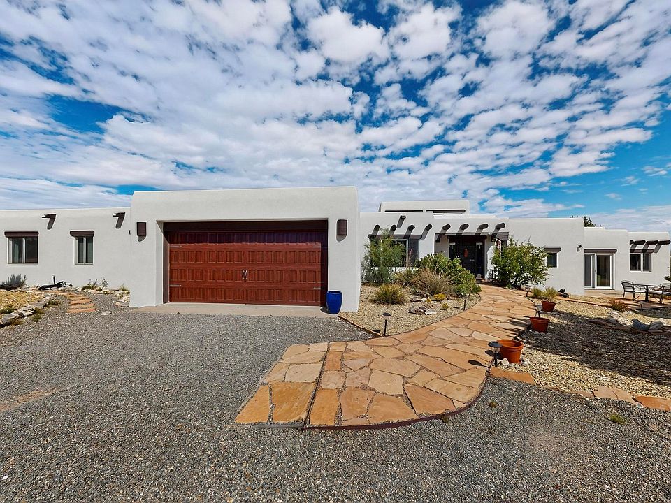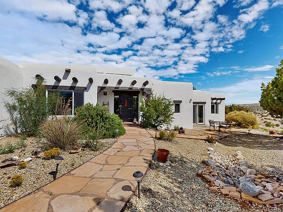 This beautiful home is nestled on a 2.65 acre lot in Rancho de Placitas. Enjoy the private peaceful setting with sensational mountain and mesa views. Southwestern rustic elegance shows throughout the home with vigas, corbels and nichos, herringbone brick floors, Talavera tile in kitchen and baths. Kitchen features an island, gorgeous wood cabinets, gas range and beautiful views from window above the sink. Enjoy the cozy living area with wood burning kiva fireplace and sliding glass doors out to covered patio. Come enjoy the city lights and breathtaking sunsets! Home backs to BLM land. New TPO roof installed Dec 2024 with transferrable warranty. New water heater and dishwasher Oct 2024.