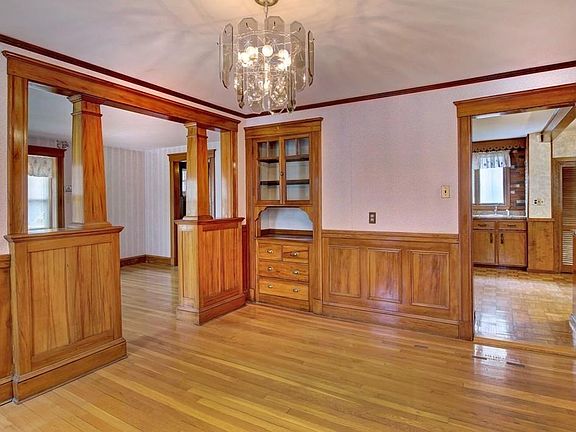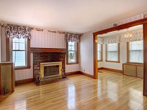 SOLID + Spacious 4 bedroom Colonial, 2.5 bath situated on a lovely street, walking distance to commuter rail. Pretty original detail of natural gumwood, built in original glass cabinetry accented with columns. Enclosed front porch leads to foyer and adjacent living room with fireplace, sun-room/den, formal dining room with built in hutch and wainscoting, large eat in kitchen with plenty of cabinets and counter space flows out onto an enclosed porch overlooking nice size yard, single car garage. ***Rare first floor bedroom suite with full bath + large closet***, Semi finished basement with half bath, laundry and updated heating system. House has been lovingly maintained by long term owner. All offers due by Monday, April 23rd, 5pm.