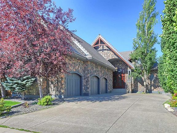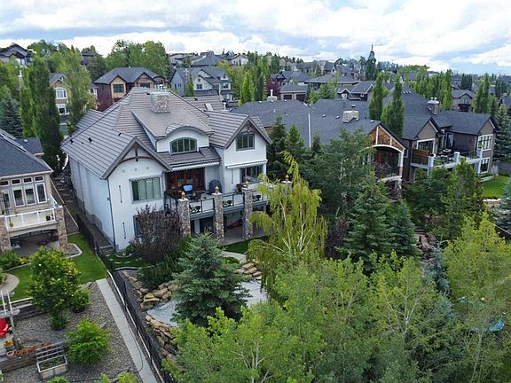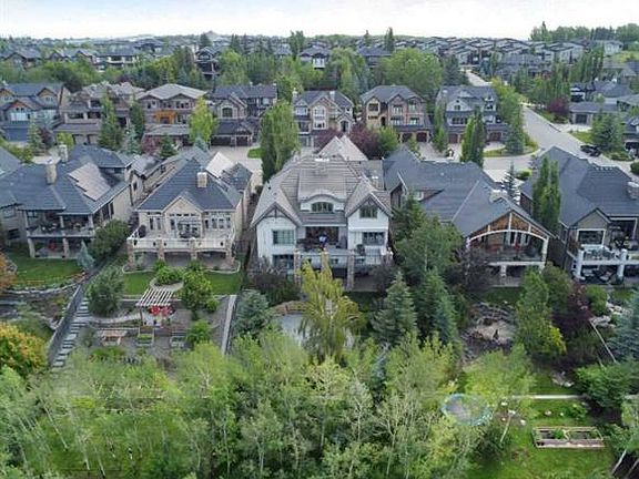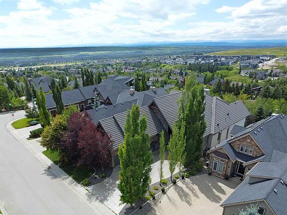 Wake up to sweeping mountain views from this timeless luxury home in prestigious Springbank Hill. Offering nearly 6,200 sq ft of refined living space across all levels, this residence blends classic design with modern comfort on a beautifully landscaped 0.30-acre lot surrounded by mature trees and lush greenery. The grand foyer sets the tone with an 18’ barrel-vault ceiling and Carrara marble floors, leading to a formal dining space with coffered ceilings and a custom stained-glass feature, and an elegant living room anchored by a 2-way fireplace and soaring barrel vault ceilings. West-facing windows frame mountain and community vistas, while French doors extend the living space outdoors to a massive private deck—perfect for evening relaxation or quiet entertaining that is virtually invisible to both neighbours. A gourmet kitchen anchors the home with custom hardwood cabinetry, dual islands, and premium appliances from Wolf, Sub-Zero, and Miele. The thoughtful layout also features a bright and airy breakfast nook and a walk-in pantry. Just off the kitchen is the full laundry room and mudroom that connects to the oversized triple garage. It features epoxy floors, a dog wash, and direct basement access, as well as additional side and front door access. The private main floor primary suite offers a serene retreat with a corner fireplace, private deck access, and a spa-inspired 5-piece ensuite featuring a steam shower, soaker tub, and dual vanities. Plus, a fully equipped walk-in closet features floor-to-ceiling storage for endless organization. Upstairs, a versatile loft with vaulted ceilings, skylights, and a fireplace offers an ideal office, library, or additional bedroom option, complete with its own 2-piece bathroom. The fully developed walkout basement is designed for both leisure and entertaining, featuring a large rec room with custom cabinetry and a wet bar, a dedicated home theatre and with some imagination, could be converted into a full-scale golf simulator! The basement also has two oversized bedrooms with private ensuites and walk-in closets. The basement also features a Tuscan-inspired full bath, perfect for showering off from the included hot tub. Outside, mature landscaping creates a private, forest-like setting, putting green, featuring a west-facing upper deck, a walkout lower patio with a hot tub, and a full-size putting green—all surrounded by stone accents and ambient lighting. Additional highlights include four fireplaces, in-floor heating, a Kinetico Water System throughout, dual central A/C, dual water tanks, high-efficiency systems, integrated home automation and security, and a durable clay tile roof. Every element reflects exceptional craftsmanship and enduring quality. Located moments from Aspen Landing, top-rated schools, and major routes, this home combines elegance, comfort, and convenience. Rarely does a residence with such commanding views and thoughtful design become available—experience the best of Springbank Hill living today.