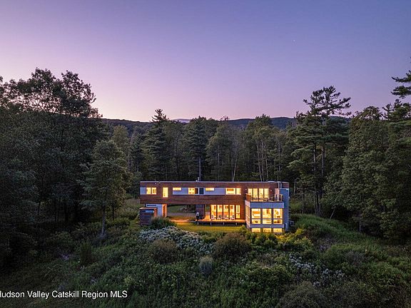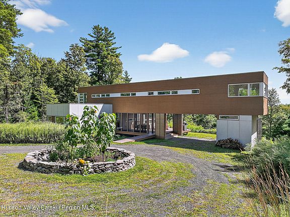 An architectural gem tucked away on 40 acres of pristine forest, this striking 3,671-square-foot residence is a stunning fusion of modern architecture and natural beauty. Crafted by the acclaimed Resolution: 4 Architecture, incorporating all of their most coveted features that converge in this divine mid century modern design. Travel down the tree lined driveway past a cascading waterfall to a world of your own- the home's distinctive silhouette rises from the trees. You're greeted by the screened in porch, ideal for al fresco dining while enjoying the art of nature as your back drop. Inside, the open concept kitchen, dining, and living space is surrounded by walls of windows framing the mountain views beyond. Its seamless integration of the indoors with the natural surroundings creates a tranquil ambiance, perfect for both entertaining and everyday living. The kitchen, a chef's dream, boasts high end appliances, sleek wood cabinetry, and a spacious island that doubles as a gathering spot. Adjacent to the kitchen, the dining area offers ample space for hosting dinner parties. The living room, with its cozy fireplace and thoughtful built ins, invites relaxation and conversation. Here, you can unwind with a good book or simply admire the ever-changing scenery through the expansive glass windows. This harmonious blend of modern elegance and rustic charm defines the home's unique character, making it a sanctuary where style and serenity coexist. Completing the main floor is a spacious, light filled bedroom with an ensuite bath. The staircase features a sleek steel wall and many windows, perfectly encompassing modern design with the splendor of nature. Upstairs, a versatile den with beautiful built in shelves and desk connects to an expansive rooftop deck. Where mountain vistas, a wood-burning fireplace, and built in landscaping create an unforgettable setting. There are 3 beds and 2 baths on this floor, each thoughtfully positioned to bask in the view through picturesque windows. At the end of the long hallway sits the primary suite, a true sanctuary of calm and luxury. This private retreat features panoramic windows that provide uninterrupted views of the surrounding forest, allowing you to wake up to the soothing sights and sounds of nature. The spacious bedroom is elegantly appointed with custom built in features that exude mid-century modern charm and an ensuite bath creating your own private haven. The lower level, finished with polished concrete, provides adaptable space for recreation, wellness, or creative pursuits. Beyond the home, the grounds are a natural paradise: winding trails, a spring-fed swimming hole, and a stocked fishing pond. This exceptional residence offers the best of both worlds: a tranquil retreat immersed in nature, and the vibrant lifestyle of the Hudson Valley just a short distance away. Whether you're seeking adventure on hiking trails, exploring charming local towns, or indulging in the region's rich culinary and artistic scene, this home provides a perfect base for every pursuit. Embrace the changing seasons with activities like skiing, kayaking, or simply enjoying the vibrant fall foliage. When you return, the warmth and elegance of this architectural wonder awaits.