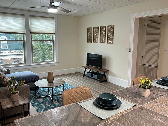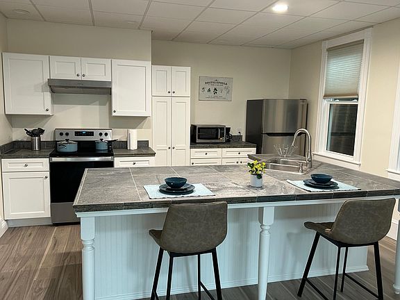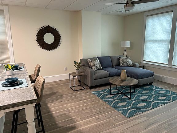 Enjoy life in this newly renovated open plan layout one bedroom second-floor apartment boasting large dine-in kitchen that opens to a spacious living room. Large windows in living areas provide abundant natural light. Brand new furnace and air conditioning provides year-round comfort in addition to ceiling fans in both the bedroom and living space. In-unit full-size washer and dryer included. Kitchen boasts all new appliances and necessary cookware, glassware, and place settings. Comfortable bedroom features blackout shades and opens to private deck. Additional hallway storage included. Bathroom features a shower stall. The unit is fully furnished with linens and towels provided. Building is conveniently located within walking distance of downtown for easy access to local shops, entertainment, and restaurants.