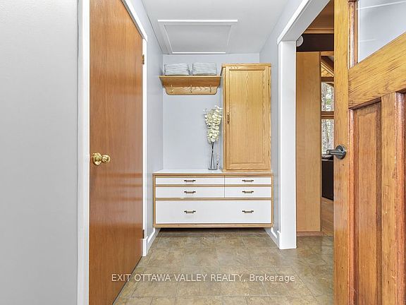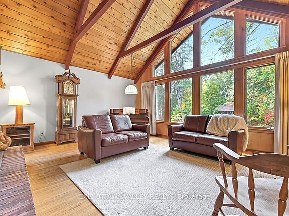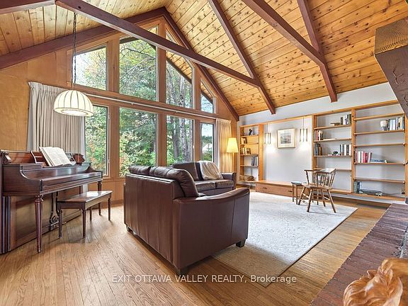 Incredibly unique custom-built 3 bedroom, 2 bath bungalow with loft, full of charm and character. The primary suite offers a cozy fireplace, updated full ensuite with double sinks, and patio doors leading to a private, oversized backyard with screened-in gazebo. The kitchen and dining area showcase beautiful wood accents, including exposed beams and oak hardwood floors and stairs, with access to the versatile loft - ideal for a home office, hobby space, or extra living area. The inviting living room boasts cathedral pine ceilings, wood beams, and a stunning floor-to-ceiling brick, wood-burning fireplace, with huge windows overlooking the serene backyard. Two additional bedrooms and a full bath complete the main floor. The lower level offers a rec room, laundry, workshop/utility room, cold storage, and plenty of potential to make it your own. A rare opportunity to own a one-of-a-kind home with warmth, privacy, and timeless character.