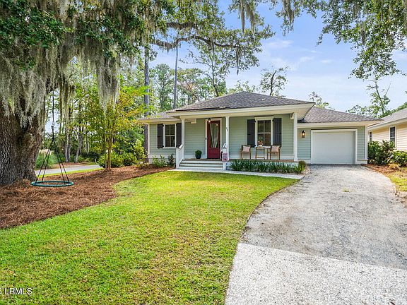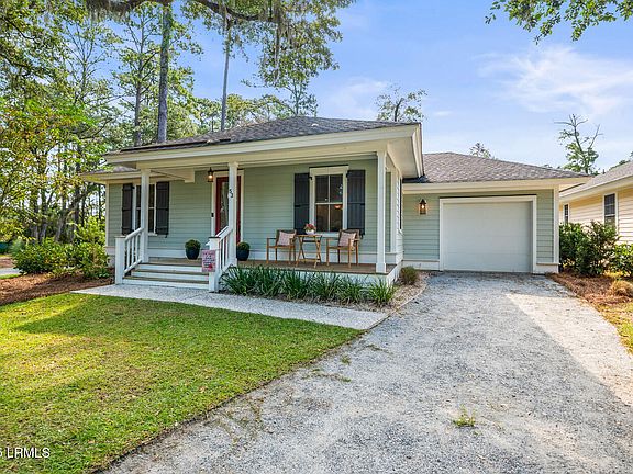 Welcome home to this beautifully crafted one-story residence by Southern Living custom builder Allen Patterson. This 3-bedroom, 2-bath home blends timeless design with thoughtful details, creating a space that feels both elevated and welcoming. Step inside to find an expansive open floor plan, accented by rich wood flooring throughout. The bright, airy kitchen steals the show with its quartz countertops, custom cabinetry, GE stainless steel appliances, and a generous center island that's perfect for gathering. The spacious primary suite offers not one but two walk-in closets, along with a spa-like bathroom featuring dual vanities with granite tops and a hand-laid tile shower. Outside, the home's curb appeal shines with its Hardi plank siding, divided light Low-E windows, and charming coach lights. Relax on the screened back porch while soaking in views of majestic live oaks and abundant wildlife a true Lowcountry backdrop. Located in the highly desirable Lady's Walk neighborhood, residents enjoy access to the community pool, clubhouse, and golf pro shop just steps away. All this, and you're just minutes from downtown Beaufort, shopping, dining, hospitals, MCAS Beaufort, and Parris Island. This is more than a house it's a lifestyle.