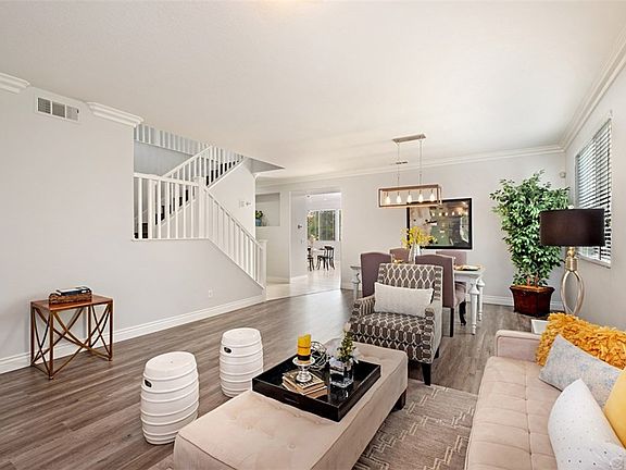 West Irvine's largest floorplan, the Norman Rockwell, is also one of its most popular. With TWO family rooms, one up and one down, there is endless space for your extended family to create all their private entertainment worlds. Lewis built these quality homes with 9-foot downstairs ceilings, which brings a feel of airiness and natural light inside. In addition to the huge master suite and adjacent retreat with a fireplace separating them, there are 4 additional bedrooms upstairs, one with bath ensuite, perfect for your privacy-loving teenager. Have family coming to visit? They'll have near total privacy in the big DOWNSTAIRS BEDROOM AND BATH. This builder configuration is 5 bedrooms/4 baths, not the standard 3 bath option. Another plus is the large laundry room with folding station. The lustrous dark granite on kitchen counters, backsplash and island adds richness, and abundant crown molding touches add elegance and flair. Bedrooms have brand-new plush carpet, with plenty of built-in closet storage. In the master bath suite you'll find a relaxing spa tub, separate shower and star-sized closet with built-ins. Gorgeous park views from the master window mean no neighbor directly behind. A giant 3-car garage with 220V electric charger holds all your toys. But the yard! There's numerous fruit trees, a peaceful fountain and a BIG lawn for parties and barbecues. Top-rated schools, quick proximity to the Tustin Marketplace and NO association dues make this your ideal forever home!