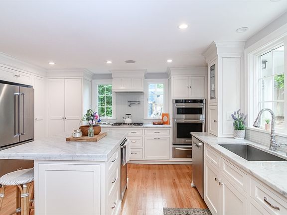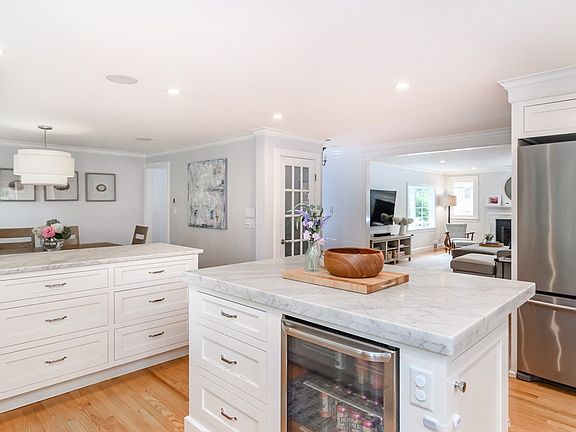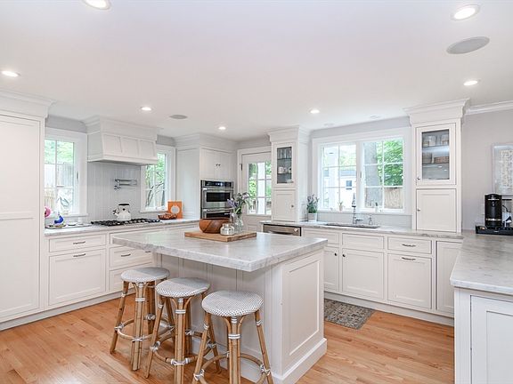 Discover refined living in this exquisitely renovated Cape, ideally located in the most beloved of neighborhoods. Bathed in natural light, the open-concept floorplan showcases impeccable design and effortless sophistication. The chef’s kitchen stuns with marble countertops, custom cabinetry and a statement island—perfect for busy mornings and entertaining. The dining area opens to the beautiful, professionally landscaped yard and the living room centers around a stunning fireplace as its focal point. The sunroom features bespoke built-ins-perfect for work from home or quiet study. A tailored mudroom ensures seamless organization. Upstairs, four spacious bedrooms including a lovely primary suite with custom walk-in closet and spa-like marble bath. The finished lower level offers flexible space for a gym or playroom. A fully equipped outdoor kitchen elevates al fresco living—an extraordinary amenity at this price. A truly special home that blends classic elegance with thoughtful updates!