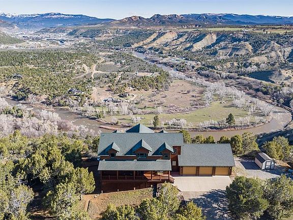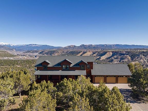 Welcome to The Overlook at Eagle View – located atop the southern Animas Valley, this stunning Colorado home boasts breathtaking views that are sure to leave you in awe. As you enter the home, you'll be greeted by an open-concept living space that seamlessly blends the indoors with the outdoors with a floor to ceiling river rock fireplace, vaulted tongue and groove ceilings, and an exquisite elk horn chandelier. Large windows throughout the home provide an abundance of natural light and offer panoramic views of the surrounding mountains and valleys giving the space a warm and inviting atmosphere. The kitchen is complete with timeless granite countertops giving ample space, high quality cabinetry, pantry, and breathtaking view from the kitchen sink. Aside from the kitchen and dining area is a spacious office suite, separate laundry and mud rooms, all leading to the phenomenally oversized 3-car garage. The bedrooms in this home are comfortable and offer plenty of space for relaxation. The main level master suite features a sizable en-suite bathroom with a large soaking tub and separate shower, providing the perfect place to unwind after a long day. The two guest suites located on the second level are large and welcome their own views of the surrounding beauty from below and are accompanied by a full and spacious bathroom. Separating the second level bedrooms is a generously sized loft perfect for capturing those stunning Animas River views from the floor to ceiling windows on the first level. On the lower level you will find the opulent finished basement with 9 foot ceilings perfect for practicing your golf swing, perhaps with a golf net or simulator. The basement also features a bar set up, plentiful room for recreational activities i.e. billiards, foosball table, ping pong table, arcade games, or even an in-home theater. Adjacent to both sides of the basement are large unfinished spaces that are great for storage. One of the unfinished spaces could potentially be finished as an extra bedroom or guest suite with its own entrance from the west side of the home. Outside, the home features an incredible deck overlooking the river valley beneath, perfect for enjoying the fresh mountain air and taking in the million dollar view. Whether you’re sipping coffee on the deck in the morning or watching the sunset over the mountains in the evening, you'll never tire of the stunning scenery that surrounds this impeccably maintained Colorado home.