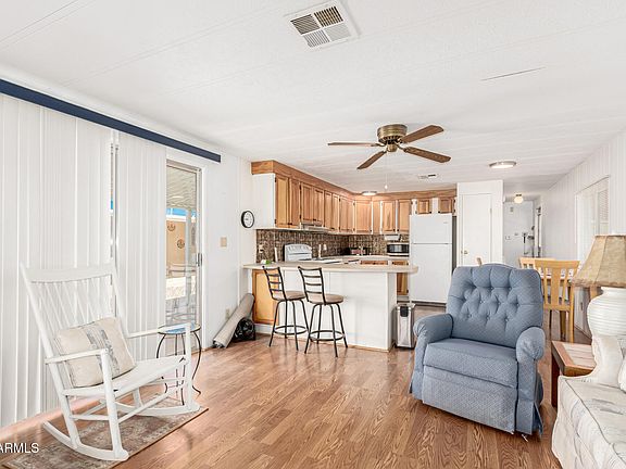 Discover effortless desert living in this fully furnished, turn-key home in a sought-after 55+ Apache Junction community. Lock-and-leave simplicity meets comfort in this bright, open-concept floor plan with wood-look flooring, neutral tones, and ceiling fans throughout. The kitchen is clean and functional with a breakfast bar, ample cabinetry, pantry storage, and matching appliances. The spacious bedroom features an easy-access sliding closet, and the washer & dryer are included—no extra hassle, no extra expense. Step outside and enjoy Arizona living on your covered patio—perfect for coffee in the morning or unwinding after a day of golf, hiking, or social activities. Low-maintenance, lock-and-go, and move-in ready. Ideal for seasonal residents, full-time living, or those looking for an easy lifestyle upgrade in a friendly community with events a social area, library and more....