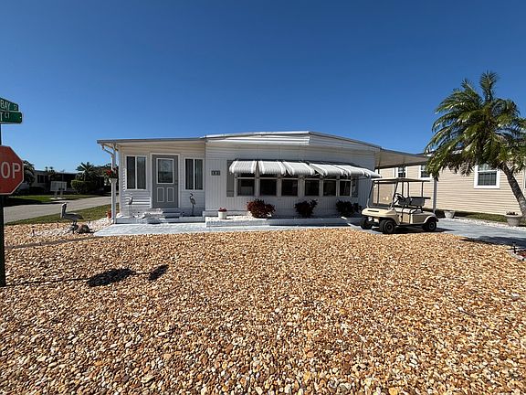 Best deal in the bay! This home shows beautifully and has been taken care of by the owner. It comes furnished with a few exclusions. The windows across the living/dining room allow so much light to radiate throughout the home and the built-in cabinet is perfect for displaying your pretty seashells or fancy dishes. The kitchen offers plenty of cabinet space and a breakfast bar. The primary bedroom has a private full bath and large walk-in closet with a separate vanity area with lots of counter space. The side lanai has a window AC and siding windows with lead glassed door. The carport keeps your car out of the Florida sun and there is a separate area for the golf cart parking too. The golf cart is included. This home is located in Jamaica Bay, a 55+ land leased community in South Fort Myers.