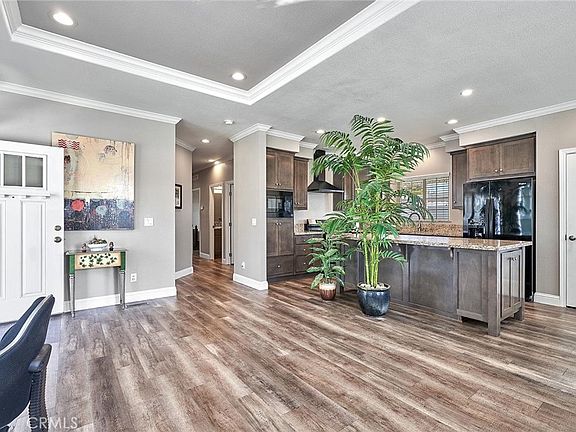 Inside, prepare to be amazed! This home defies expectations with its spacious open living area featuring upgraded wood-style flooring, stylish designer paint, and elegant crown moldings. The kitchen is a delight, boasting warm wood cabinetry, stainless steel and black appliances, a generous amount of counter space, and a fantastic center island with a pantry.