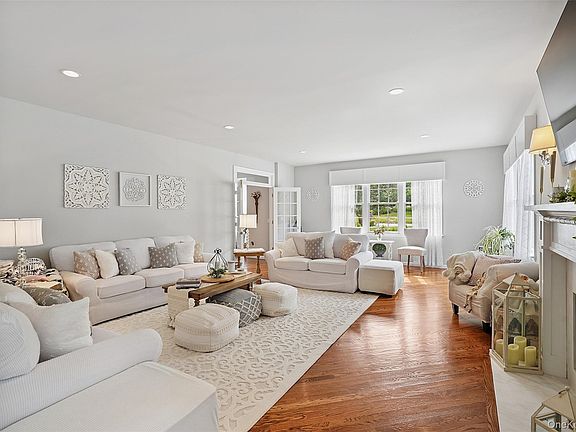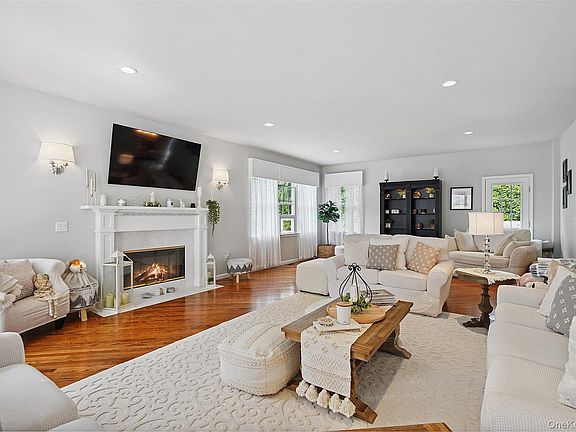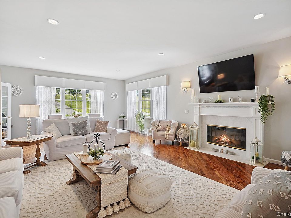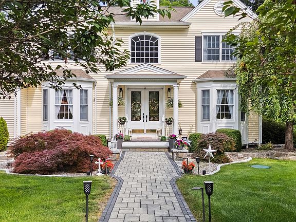 Welcome to this absolutely stunning four-bedroom Colonial, perfectly situated on a peaceful cul-de-sac and set on over two beautifully landscaped acres. With professional landscaping, mature plantings, and tranquil surroundings, this home offers both privacy and elegance. As you step into the gracious two-story foyer, you’ll be immediately impressed by pristine hardwood floors, soaring ceilings, and exquisite custom moldings that flow throughout the home. Designed for both everyday living and grand entertaining, the spacious living room features a warm gas fireplace and seamless flow into the gourmet kitchen. The kitchen is a chef’s dream, complete with high-end stainless steel appliances, quartz countertops, a large center island, and a generous walk-in pantry. Thoughtful lighting includes recessed fixtures, wall sconces, and elegant chandeliers—complete with a motorized lift for easy maintenance.