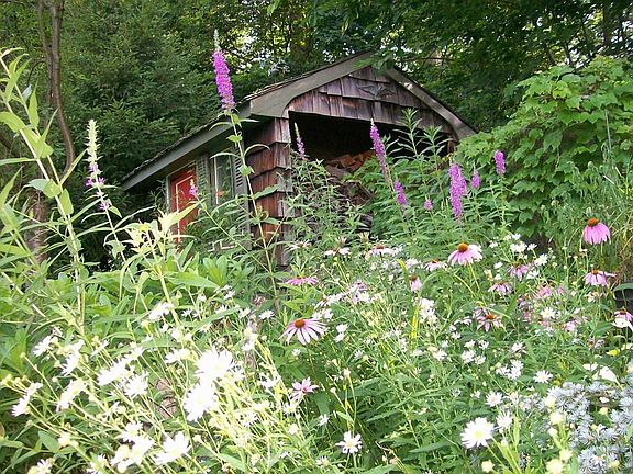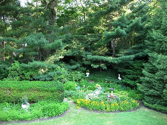 This lovely home looks small from outside, but inside is large. 4-5 Bedrooms, 3 full baths. The expansive updated kitchen offers wet bar, island, outdoor access with many cabinets. The F/R is conveniently adjoined offering a window seat, built-ins, and chimney w/the poss. of wood stove (buyer would have to address that). Generous living room w/gas fireplace. A bedroom and office/bedroom with many built-ins and renovated full bath2/jacuzzi complete 1st fl. The second floor offers two king-size bedrooms and a new stall shower bathroom. There is room to add a tub if desired with minor renovations. The master's sliding door goes to a huge rooftop deck overlooking beautiful gardens and foliage that have been lovingly taken care of. Basement offers laundry, storage, bedroom ensuite and large bonus room. Privacy abounds the yard with garden house, quoi pond, fountains and brick patio. The huge back hall accesses front and back, Garage has ee doors on both ends, Many other amenities.