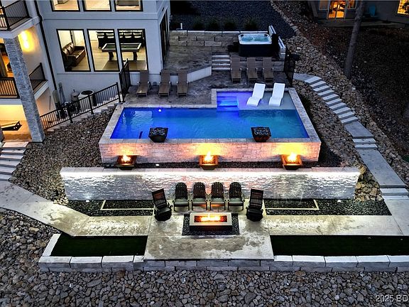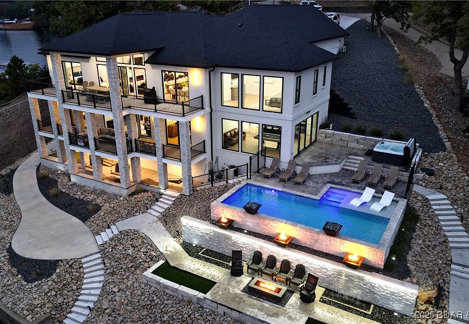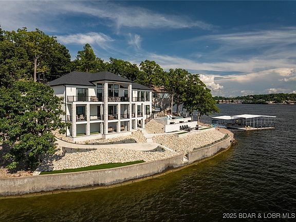 Step into this luxury lakefront home nestled in the scenic hills of the Lake of the Ozarks. Designed with relaxation, gathering, and elevated living in mind, this stunning retreat offers spacious accommodations, refined interior design. Home features: Two primary suites upstairs, Each features premium Riverside Cascade furnishings, white oak flooring, and peaceful lakefront views right from bed. 5 more additional stylish bedrooms each thoughtfully designed with luxurious touches and cozy finishes. Also includes A fully private attached apartment, perfect for guests. Two expansive living areas that welcome gathering, play, and conversation. Upstairs, enjoy the white oak floors, designer furnishings from Bassett, La-Z-Boy, Four Hands, and Uttermost, and an oversized dining table perfect for long family dinners. Downstairs, you’ll find a game room and bar and walkout access to pool. Dine! Relax! Entertain! The chef’s kitchen flows into a luxurious dining room anchored by a Four Hands dining table that seats 12 Amisco upholstered dining chairs, Outdoor perks include hot tub, swimming pool & Lakeside firepit 160 ft of lake frontage. Just minutes from dining & shopping by water or land.
